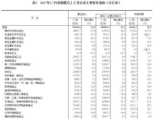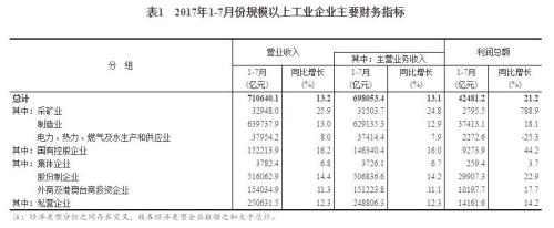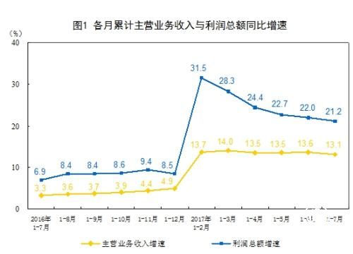 據(jù)國(guó)家統(tǒng)計(jì)局官網(wǎng)消息,2017年1至7月份,全國(guó)規(guī)模以上工業(yè)企業(yè)實(shí)現(xiàn)利潤(rùn)總額42481.2億元,同比增長(zhǎng)21.2%,增速比1至6月份放緩0.8個(gè)百分點(diǎn)。
