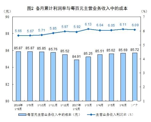 1-7月份,規(guī)模以上工業(yè)企業(yè)實(shí)現(xiàn)主營(yíng)業(yè)務(wù)收入69.8萬(wàn)億元,同比增長(zhǎng)13.1%;發(fā)生主營(yíng)業(yè)務(wù)成本59.8萬(wàn)億元,增長(zhǎng)13.1%;主營(yíng)業(yè)務(wù)收入利潤(rùn)率為6.09%,同比提高0.41個(gè)百分點(diǎn)。