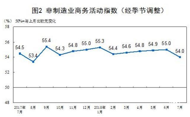 2018年7月份,中國非制造業(yè)商務活動指數(shù)為54.0%,比上月回落1.0個百分點,連續(xù)11個月保持在54.0%及以上的較高景氣區(qū)間,表明非制造業(yè)繼續(xù)保持較快增長。