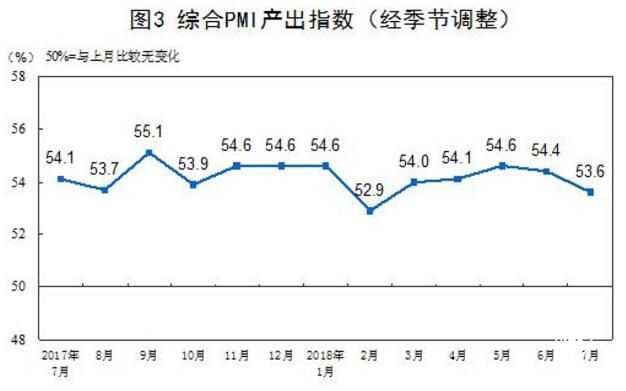 2018年7月份,綜合PMI產出指數(shù)為53.6%,低于上月0.8個百分點,表明我國企業(yè)生產經營活動總體繼續(xù)保持擴張,但步伐放緩。