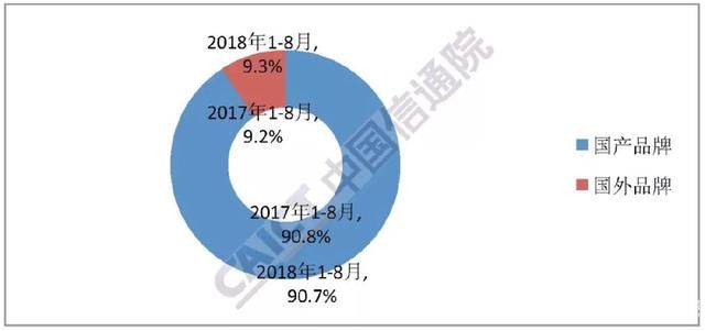 國產(chǎn)品牌手機(jī)出貨量總體規(guī)模下降,份額穩(wěn)定。2018年8月,國產(chǎn)品牌手機(jī)出貨量3025.0萬部,同比下降20.6%,占同期國內(nèi)手機(jī)出貨量的92.8%;上市新機(jī)型52款,同比下降33.3%,占同期國內(nèi)手機(jī)上市新機(jī)型數(shù)量的94.5%。2018年1-8月,國產(chǎn)品牌手機(jī)出貨量2.41億部,同比下降17.8%,占同期國內(nèi)手機(jī)出貨量的90.7%;上市新機(jī)型499款,同比下降23.5%,占同期國內(nèi)手機(jī)上市新機(jī)型數(shù)量的91.7%。
