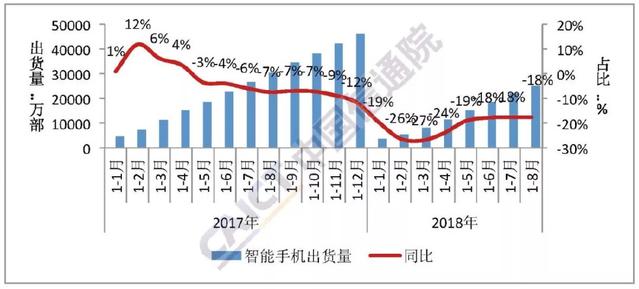 圖1 2017年至2018年8月國內(nèi)手機(jī)出貨量情況