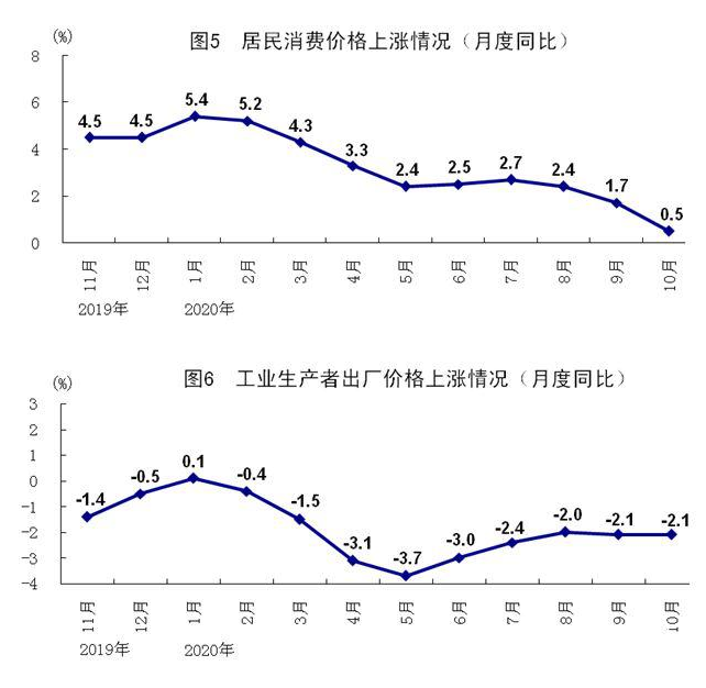 10月份,全國工業(yè)生產(chǎn)者出廠價格同比下降2.1%,降幅與9月份持平;環(huán)比持平。工業(yè)生產(chǎn)者購進價格同比下降2.4%,降幅比9月份擴大0.1個百分點;環(huán)比上漲0.2%。1-10月份,全國工業(yè)生產(chǎn)者出廠價格和工業(yè)生產(chǎn)者購進價格同比分別下降2.0%、2.6%。