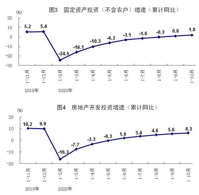 1-10月份,全國固定資產(chǎn)投資(不含農(nóng)戶)同比增長1.8%,比1-9月份加快1.0個百分點;10月份環(huán)比增長3.22%。分領域看,基礎設施投資同比增長0.7%,比1-9月份加快0.5個百分點;制造業(yè)投資下降5.3%,降幅比1-9月份收窄1.2個百分點;房地產(chǎn)開發(fā)投資增長6.3%,比1-9月份加快0.7個百分點。全國商品房銷售面積133294萬平方米,同比持平,1-9月份為下降1.8%;商品房銷售額131665億元,增長5.8%,比1-9月份加快2.1個百分點。分產(chǎn)業(yè)看,第一產(chǎn)業(yè)投資同比增長17.3%,比1-9月份加快2.8個百分點;第二產(chǎn)業(yè)投資下降2.1%,降幅比1-9月份收窄1.3個百分點;第三產(chǎn)業(yè)投資增長3.0%,比1-9月份加快0.7個百分點。高技術產(chǎn)業(yè)投資同比增長9.7%,比1-9月份加快0.6個百分點;其中高技術制造業(yè)和高技術服務業(yè)投資分別增長10.0%、9.4%。高技術制造業(yè)中,醫(yī)藥制造業(yè)、計算機及辦公設備制造業(yè)投資分別增長22.8%、14.8%;高技術服務業(yè)中,電子商務服務業(yè)、科技成果轉化服務業(yè)投資分別增長26.5%、17.2%。社會領域投資同比增長10.6%,其中衛(wèi)生、教育投資分別增長24.1%、13.1%。