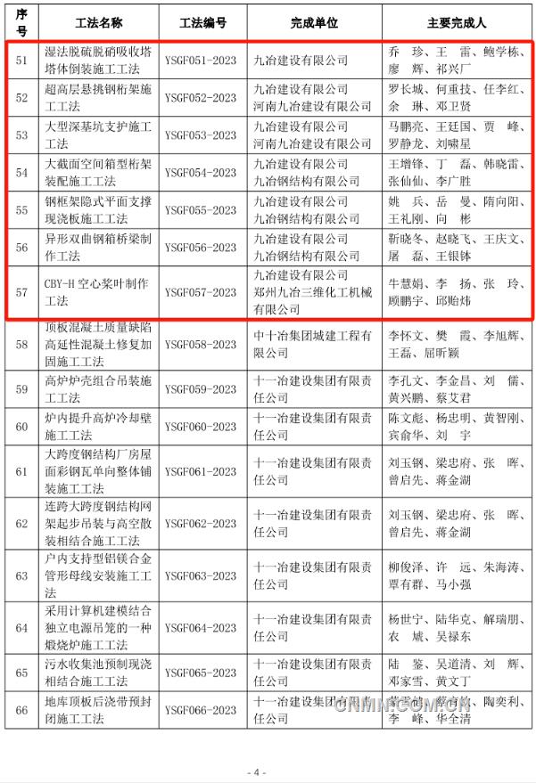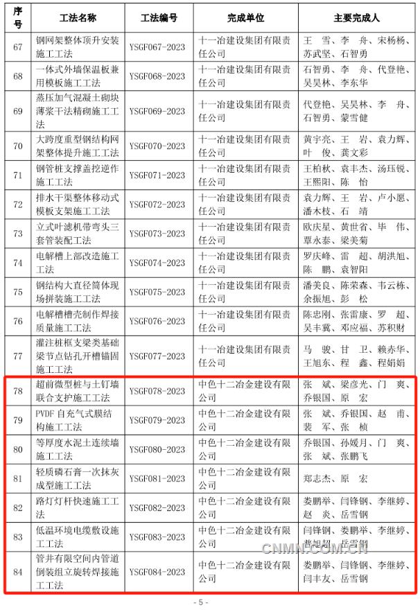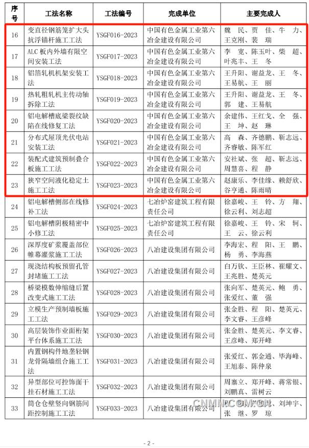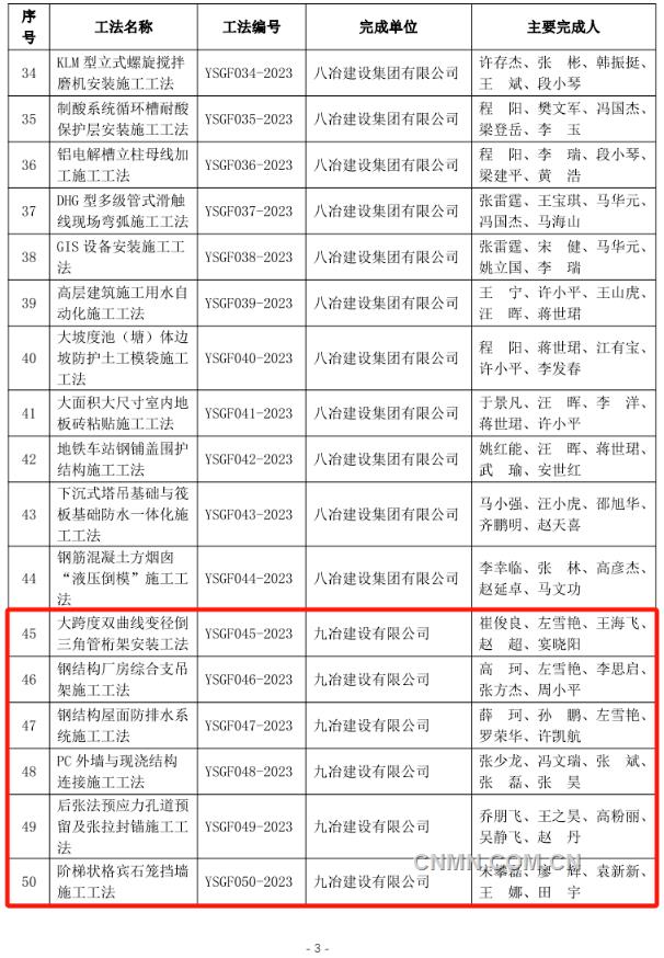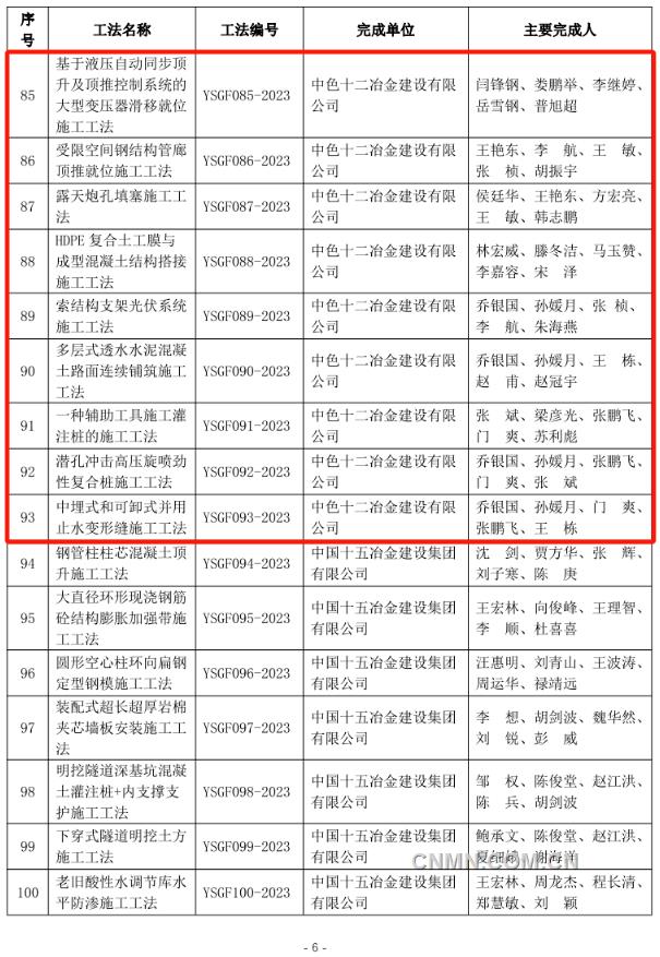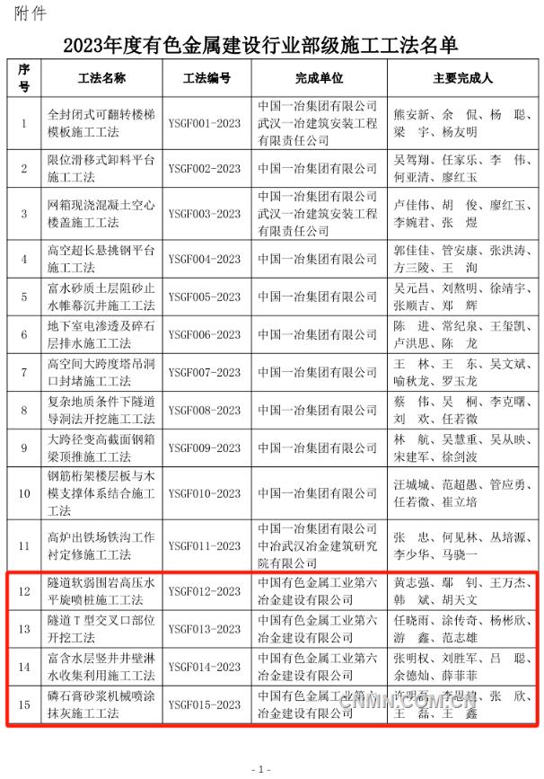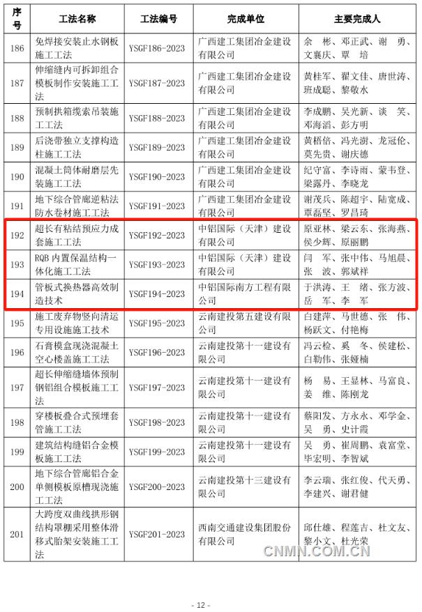 近日,中國(guó)有色金屬建設(shè)協(xié)會(huì)公布2023年度部級(jí)施工工法名單,經(jīng)企業(yè)申報(bào)、專(zhuān)家評(píng)價(jià)、集中評(píng)審、網(wǎng)上公示等程序,中鋁國(guó)際所屬六冶、九冶、十二冶、天津建設(shè)、中鋁國(guó)際南方工程等單位申報(bào)的44項(xiàng)工法榜上有名。