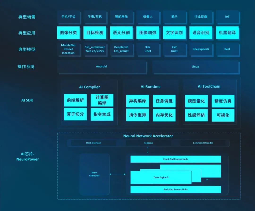 紫光展銳AI軟件??蓪I計算任務(wù)分配到不同的硬件計算單元,如CPU、NPU、GPU、VDSP等,充分利用SoC不同計算單元的所有算力,提高AI應(yīng)用運行效率。同時支持200+主流神經(jīng)網(wǎng)絡(luò)算子,為客戶和開發(fā)者提供便捷的開發(fā)接入和調(diào)試環(huán)境,推動AI應(yīng)用延伸至智能電視、電競顯示、智能投影、汽車等更廣泛的終端設(shè)備上,也為紫光展銳賦能AI應(yīng)用生態(tài)奠定了基礎(chǔ)。