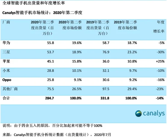 根據(jù)Canalys的另一份報(bào)告顯示,2020年第二季度,雖然華為在歐洲市場(chǎng)銷量有所下降,但是其全球出貨量為5580萬(wàn)部,以19.6%的市場(chǎng)份額位居第一位居。而三星則以18.9%的市場(chǎng)份額位居第二。