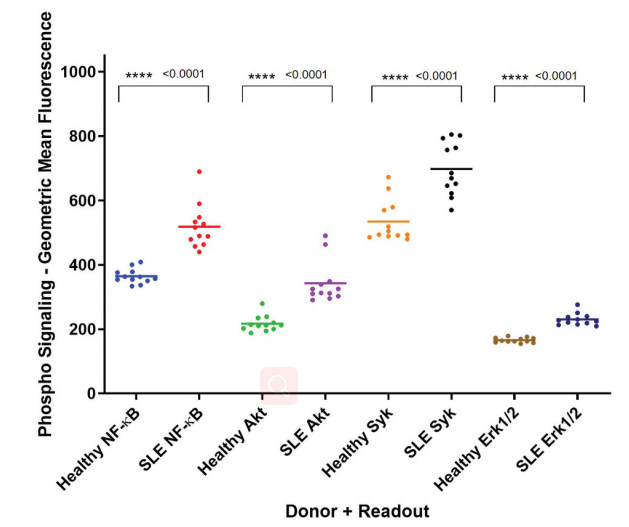 最近,研究人員發(fā)現(xiàn),與健康志愿者相比,系統(tǒng)性紅斑狼瘡患者外周血單核細(xì)胞樣本的BCR通路激活程度更高,關(guān)鍵信號(hào)節(jié)點(diǎn)Syk、Akt、NF-κB 和 Erk1/2的磷酸化水平明顯提高。