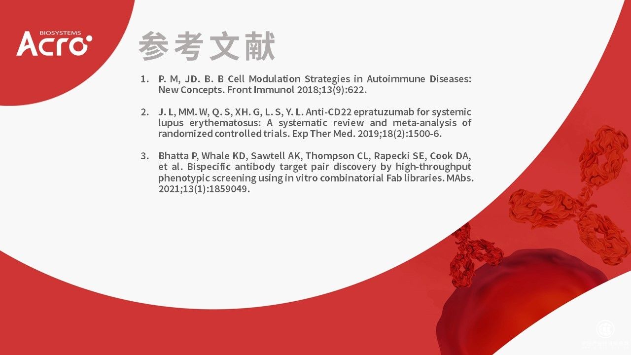 ACROBiosystems百普賽斯主要產(chǎn)品及服務(wù)包括蛋白、抗體、試劑盒及分析檢測(cè)服務(wù),應(yīng)用于腫瘤、自身免疫疾病、心血管病、傳染病等疾病的藥物篩選及優(yōu)化、臨床前實(shí)驗(yàn)及臨床試驗(yàn)、藥物生產(chǎn)過程及工藝控制(CMC)、診斷試劑開發(fā)及優(yōu)化等研發(fā)及生產(chǎn)環(huán)節(jié)。