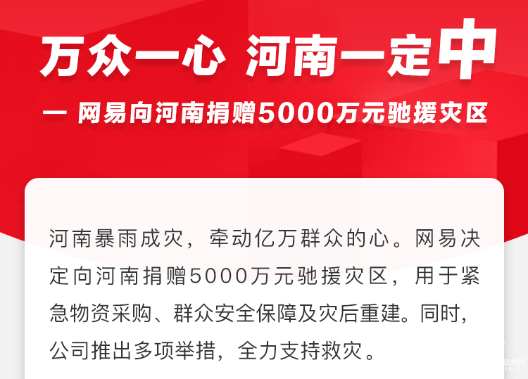 今年7月,河南暴雨牽動億萬人心。面對重大災(zāi)情,網(wǎng)易宣布捐款5000萬元馳援災(zāi)區(qū)。隨后,網(wǎng)易《大話西游》宣布為河南抗洪救災(zāi)捐贈100萬元;《逆水寒》則以全體玩家名義聯(lián)動河南嵩山少林寺共同出資200萬元,用于幫扶災(zāi)區(qū)農(nóng)村兒童。網(wǎng)易新聞與網(wǎng)易云音樂發(fā)起公益演唱會,收入全額捐贈鄭州紅會。