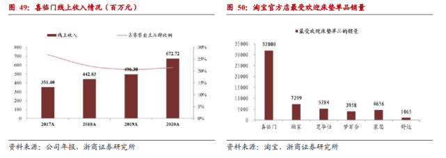 浙商證券認為,渠道擴張(包括線下門店和電商)和品牌營銷推廣,是當前中國床墊龍頭跑贏行業(yè)、實現(xiàn)集中度提升的勝負手;而內(nèi)銷床墊伴隨滲透率提升、翻新需求興起有望保持雙位數(shù)的增長。喜臨門作為床墊第一股,內(nèi)銷自主品牌業(yè)務保持高增,線下高速開店+電商霸主地位牢固,同時品牌營銷方面持續(xù)把自己打造為國民品牌形象,有望后續(xù)份額角逐中率先取得優(yōu)勢。