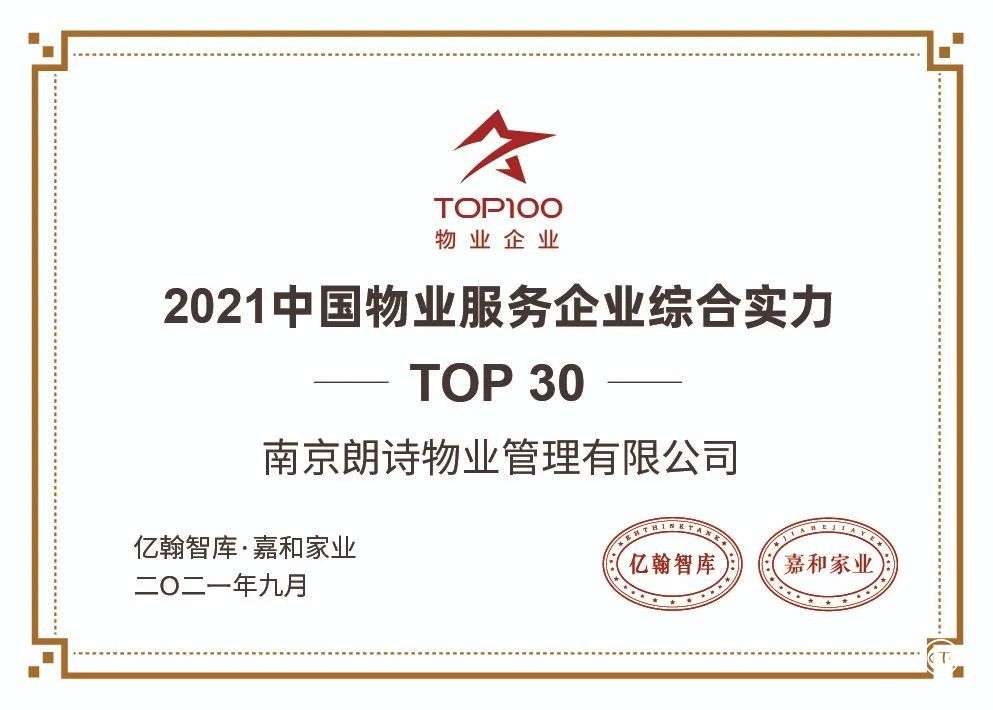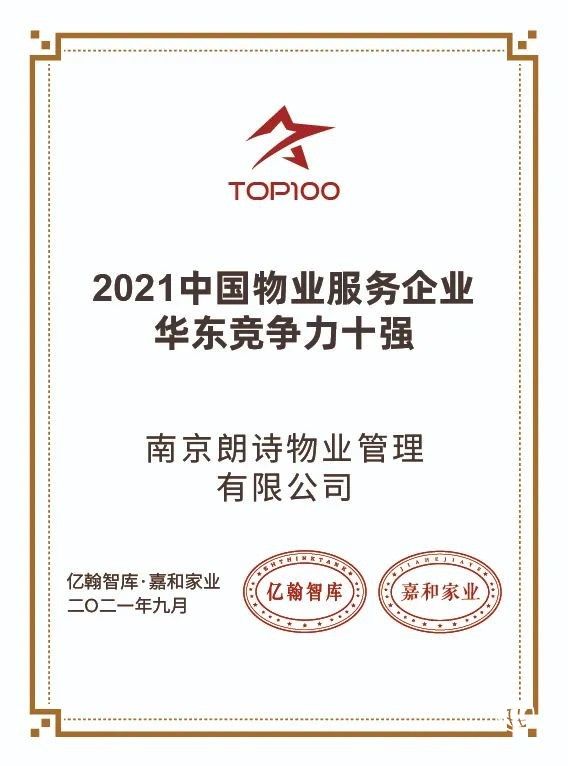 在由億翰智庫、嘉和家業(yè)主辦的“ 2021中國房地產(chǎn)業(yè)戰(zhàn)略峰會暨2021中國物業(yè)服務(wù)企業(yè)百強峰會”上,朗詩綠色生活榮獲“2021中國物業(yè)服務(wù)企業(yè)綜合實力TOP30”“2021中國物業(yè)服務(wù)企業(yè)客戶滿意度模范企業(yè)五十強”“2021中國物業(yè)服務(wù)企業(yè)華東競爭力十強”“2021中國物業(yè)服務(wù)企業(yè)運營能力十強”“2021中國物業(yè)服務(wù)企業(yè)社群運營標(biāo)桿企業(yè)”五項榮譽。