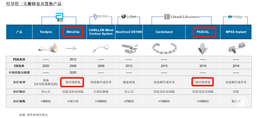 全球已經(jīng)上市的二尖瓣緣對緣修復(fù)產(chǎn)品包括MitraClip和PASCAL,目前全球已有超10萬名MR患者接受了MitraClip治療。在國際市場上,MitraClip相對來說最為成熟。PASCAL由美國的愛德華生命科學(xué)研發(fā),目前僅獲得CE批準(zhǔn),其設(shè)計原理類似MitraClip。
