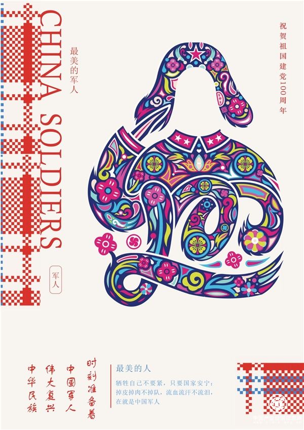 創(chuàng)意思想:中國(guó)軍人這個(gè)作品上面兩個(gè)字是采用一些傳統(tǒng)建筑物和傳統(tǒng)人物服裝拼成的,下面軍人是采用軍人的形象與100這個(gè)數(shù)字結(jié)合,慶祝建黨一百周年。