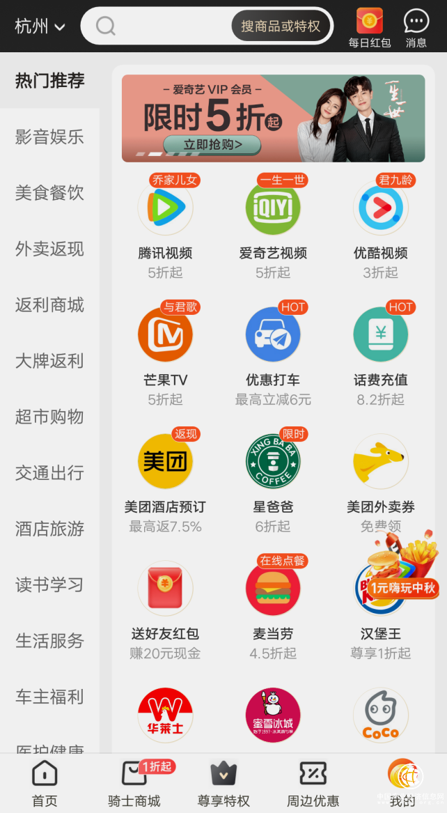 全球購騎士卡的優(yōu)惠涵蓋范圍比較廣泛,平臺上的權益涉及到了各個消費場景。在生活服務上有超市購物、醫(yī)護健康、讀書學習等特價優(yōu)惠,在休閑娛樂上有影視影音、酒店旅游等打折返現(xiàn),在飲食上有美食餐飲、外賣返現(xiàn)等特價優(yōu)惠券。往小了說騎士卡相當于各種會員卡的合集,讓我們這些消費者能一張卡享受多種會員優(yōu)惠福利,也可以理解為騎士卡就是把生活里各個細節(jié)的優(yōu)惠收集在一起,讓我們能更加便捷地找到商家福利。