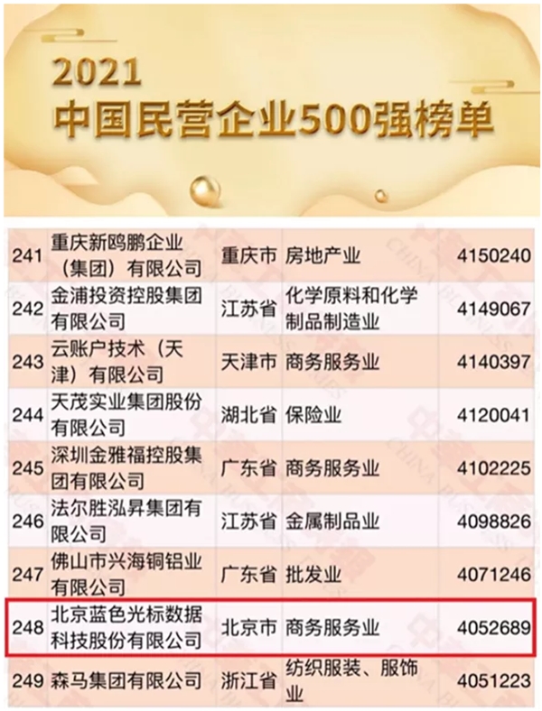 9月25日,一年一度的“中國民營企業(yè)500強”峰會在湖南長沙舉行,會上發(fā)布了2021中國民營企業(yè)500強榜單。藍色光標作為唯一一家營銷傳播類企業(yè),以405億元營業(yè)收入再登中國民營企業(yè)500強榜單,位列第248位,較去年排名大幅提升86位。