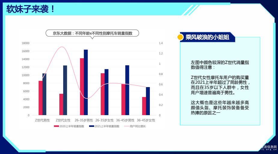 汽車(chē)消費(fèi)之外,摩托車(chē)領(lǐng)域更是Z世代騎士們的主戰(zhàn)場(chǎng)。隨著摩托車(chē)政策的變化,以代步、通勤為主的需求正在快速增長(zhǎng),同時(shí)Z世代引領(lǐng)的以騎行、玩酷為代表的摩旅文化也在快速發(fā)展。此外,還有一個(gè)有趣的現(xiàn)象值得關(guān)注,Z世代女性摩托車(chē)用戶(hù)的購(gòu)買(mǎi)量,在2021上半年超過(guò)了同齡男性,可見(jiàn)炫酷的摩托車(chē)正在俘獲小姐姐的“芳心”。