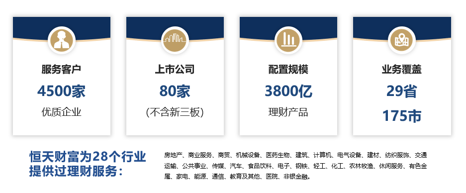 在近幾年的經(jīng)濟(jì)發(fā)展和金融出清中,恒天財(cái)富深耕企業(yè)金融服務(wù)領(lǐng)域,助力企業(yè)基業(yè)長(zhǎng)青,在2019年推出首個(gè)企業(yè)金融服務(wù)品牌——企金會(huì),以“為企業(yè)提供全面金融服務(wù)”為宗旨,從金融顧問(wèn)、研究顧問(wèn)、產(chǎn)業(yè)顧問(wèn)、法律財(cái)稅顧問(wèn)服務(wù)四個(gè)方面全面為企業(yè)客戶(hù)提供專(zhuān)業(yè)服務(wù)。