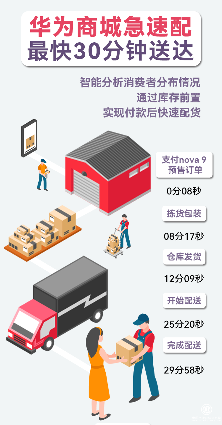 10:08完成支付、10:13安排發(fā)貨,10:15極速送前置倉正式發(fā)貨,10:31正式簽收。在9月29日的華為nova 9首發(fā)日,一場極速速遞在深圳悄悄上演,華為商城nova 9系列第一單僅用時不到半小時就送到深圳消費者手中。