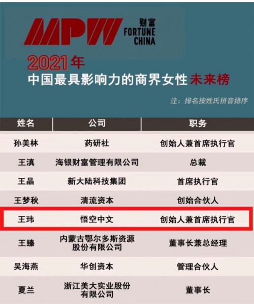 近日,全球知名財(cái)經(jīng)雜志《財(cái)富》中文網(wǎng)公布了“2021中國(guó)最具影響力的商界女性榜”與“2021中國(guó)最具影響力的商界女性·未來(lái)榜”入選名單,悟空中文創(chuàng)始人兼CEO 王瑋(Vicky)憑借在全球在線教育領(lǐng)域的影響力入選“中國(guó)最具影響力的商界女性·未來(lái)榜”。