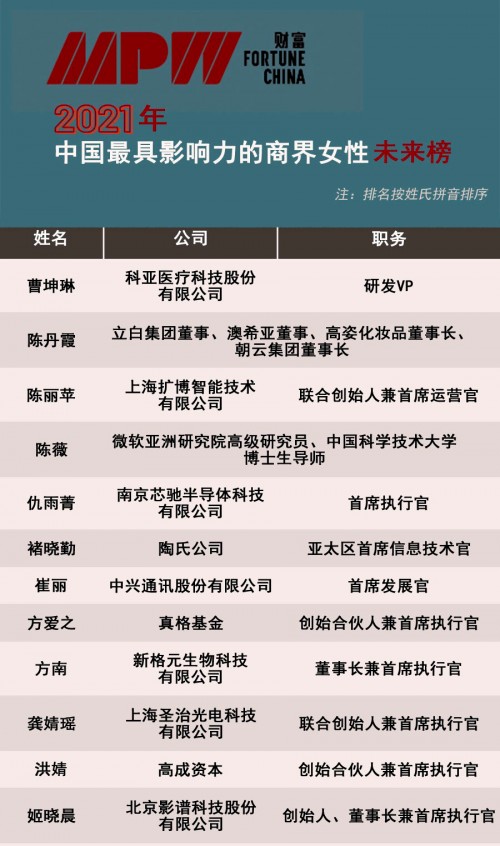 附:《財(cái)富》“2021中國(guó)最具影響力的商界女性·未來(lái)榜”完整榜單