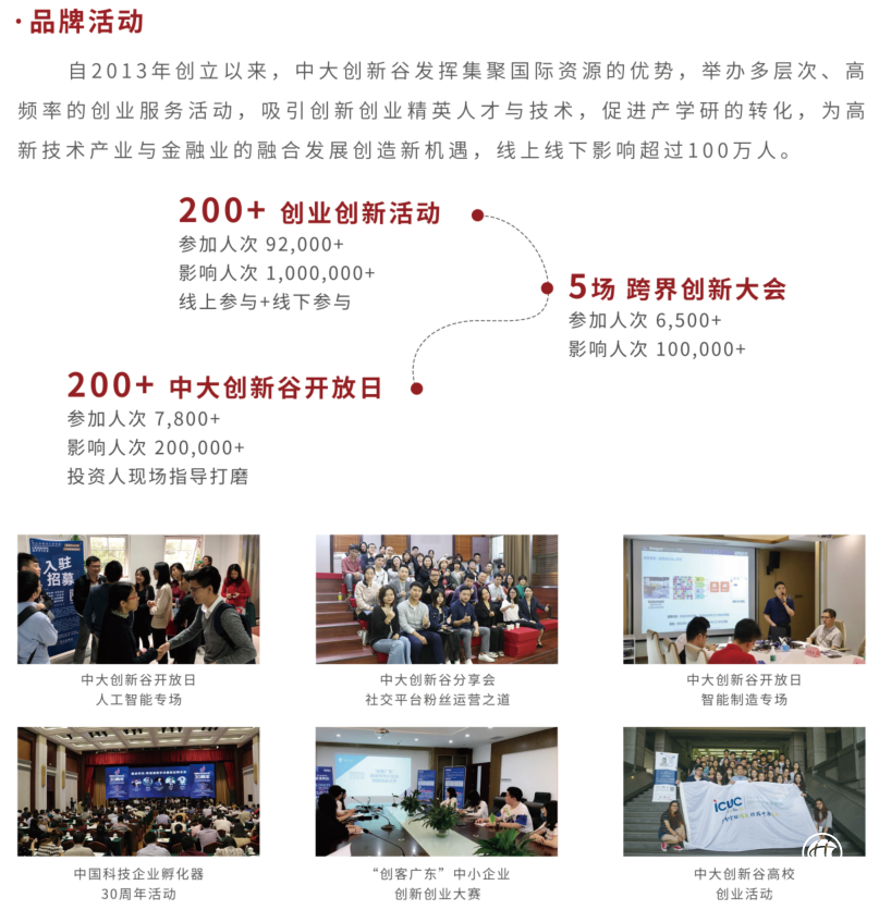 中大創(chuàng)新谷通過(guò)舉辦高端行業(yè)交流活動(dòng),與知名學(xué)者、行業(yè)領(lǐng)袖、創(chuàng)投大咖等思想碰撞;通過(guò)企業(yè)考察,開(kāi)拓視野,激發(fā)創(chuàng)新思維;通過(guò)主題交流會(huì)、開(kāi)放日、創(chuàng)新大賽、高峰論壇等活動(dòng),聚合創(chuàng)新資源,加速思維碰撞,尋找合作機(jī)會(huì)。