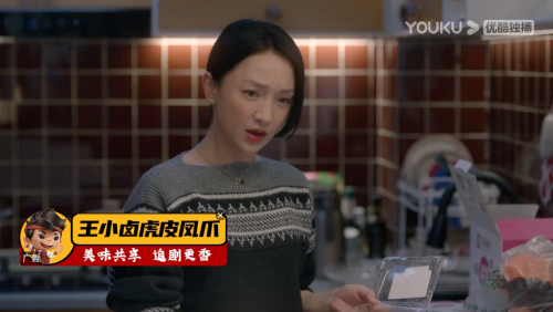 在周迅飾演的劉小敏和妹妹聊天時(shí)出現(xiàn)“美味共享,追劇更香”。