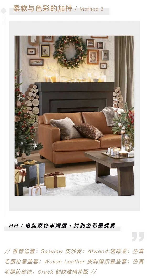 掛滿禮盒的圣誕樹(shù)現(xiàn)身房間,桌邊的燭光搖曳,伴著室外漸暗的天色,不足以點(diǎn)亮整片空間,卻是營(yíng)造暖意的良物。恰應(yīng)的靠墊、披毯的色彩和紋樣也能達(dá)到裝飾效果,而且可以長(zhǎng)久使用,更為環(huán)保。