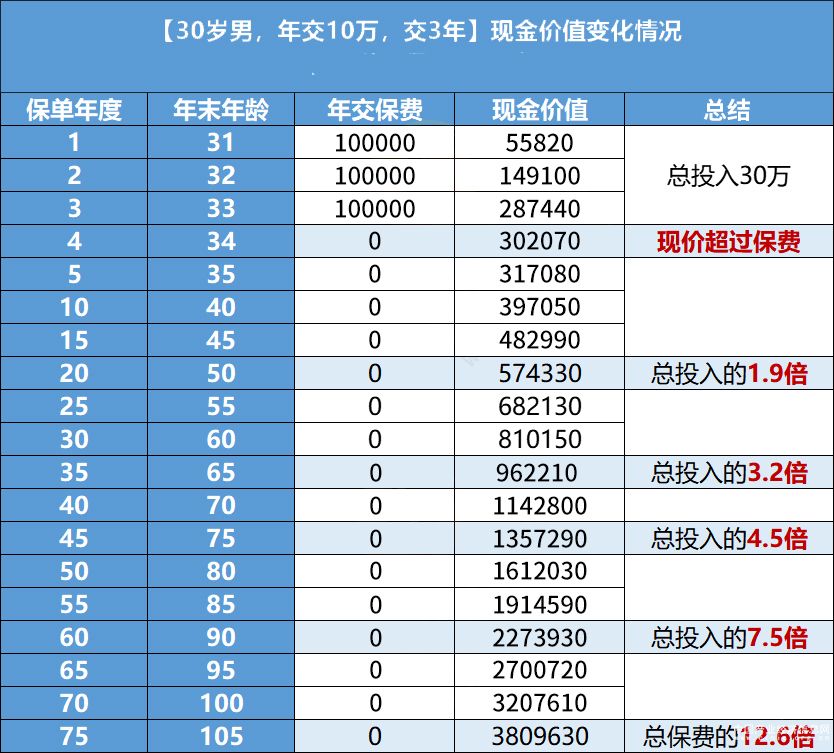 30歲男性投保利多多增額終身壽,年交保費(fèi)10萬,交3年,現(xiàn)金價(jià)值變化情況如下圖所示: