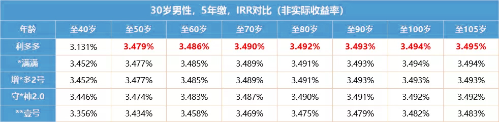 可以看出,利多多的IRR最高達(dá)到了3.495%,至其它年齡段的IRR表現(xiàn)也非常不錯(cuò)。
