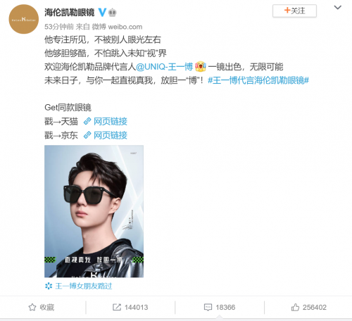 “一官宣就秒下單,終于讓我搶到一博同款”“咱就是說,酷蓋代言的眼鏡一整個愛住”……12月24日,新生代人氣偶像王一博又雙叒叕解鎖新身份,成為海倫凱勒眼鏡全新品牌代言人,迅速引爆了粉絲的購物熱情。