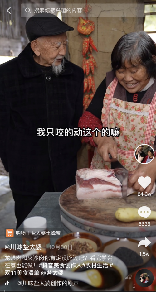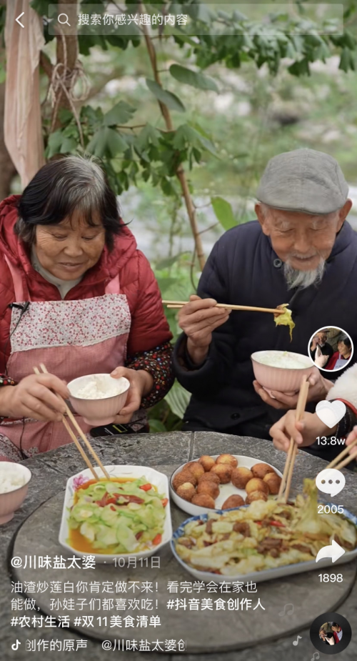 抖音號“川味鹽太婆”的視頻里,漆爺爺有些撒嬌喊著“老太婆”三個字一出場,就意味著一頓美食將展現(xiàn)在大家面前。來自四川廣元80多歲的漆爺爺和他的老伴閻婆婆,因制作美食視頻被上千萬粉絲關(guān)注。一對農(nóng)村老人,能在網(wǎng)絡(luò)備受關(guān)注,這樣的“老來紅”在以前是很難想象的。