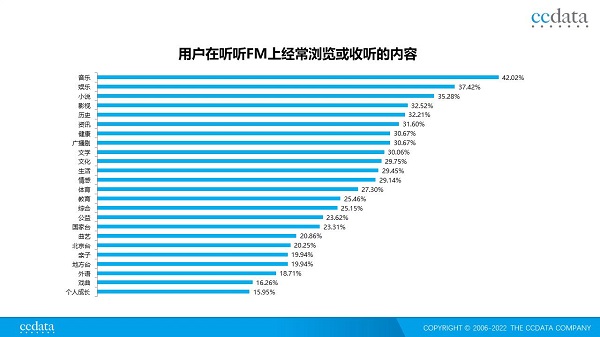 數(shù)據(jù)顯示,用戶在聽聽FM上除收聽廣播節(jié)目外,還大量關(guān)注與收聽了音樂、娛樂、小說、影視等娛樂性內(nèi)容,以及歷史、健康、生活、情感、體育、教育等垂直性內(nèi)容,用戶的多元化訴求在聽聽FM上得到了充分滿足,平臺黏性突出。