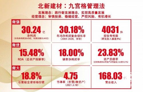 1.業(yè)績(jī)十分優(yōu)異。在行業(yè)面臨嚴(yán)峻形勢(shì)的2021年,北新建材前三季度實(shí)現(xiàn)收入、利潤(rùn)雙增30%,三大主業(yè)產(chǎn)銷量均實(shí)現(xiàn)增長(zhǎng)。實(shí)施九宮格管理法來約束和激勵(lì)企業(yè),實(shí)現(xiàn)高質(zhì)量發(fā)展。九宮格管理里面很多指標(biāo)的標(biāo)準(zhǔn)很高,比如“凈利潤(rùn)復(fù)合增長(zhǎng)率”。十幾年來,北新建材年均凈利潤(rùn)復(fù)合增長(zhǎng)率(2004-2020)達(dá)30%,非常不容易。平均收入利潤(rùn)率、平均兩金占收入比、平均資本回報(bào)率等財(cái)務(wù)指標(biāo)優(yōu)秀。