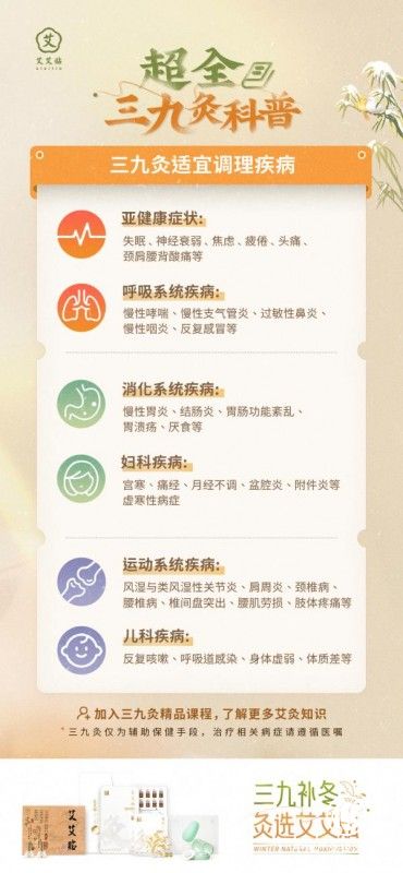 針對腸胃負(fù)擔(dān)、氣血不足、手腳冰涼等冬季常見問題及用戶扶陽補(bǔ)溫、增強(qiáng)抵抗力等需求,艾艾貼推出三九補(bǔ)冬暖系養(yǎng)生套餐,以不同的組合方案,滿足大眾的不同需求。如三九灸深度調(diào)理套餐中,便包含了艾艾貼艾灸精華貼、艾艾貼牌艾灸器等艾艾貼王牌產(chǎn)品,以及三九天精品養(yǎng)生課程名額和福袋,賦能用戶深度調(diào)理。