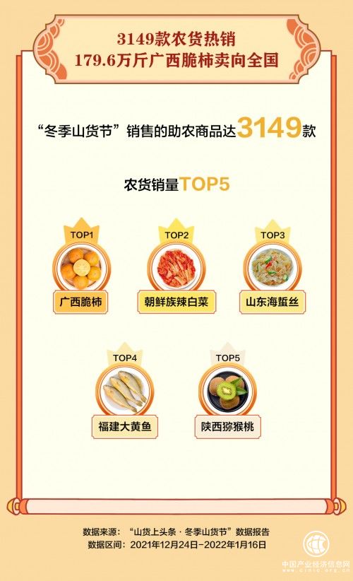 各地具有代表性的農(nóng)特產(chǎn)在活動期間頗受歡迎,區(qū)域農(nóng)業(yè)品牌在短視頻和直播的推介下,不斷拓展市場認(rèn)知度和影響力。數(shù)據(jù)顯示,“冬季山貨節(jié)”銷售的助農(nóng)商品達(dá)3149款,廣西脆柿、朝鮮族辣白菜、山東海蜇絲、福建大黃魚和陜西獼猴桃銷量領(lǐng)先。24天內(nèi),共有179.6萬斤廣西脆柿銷往各地,賣出的辣白菜相當(dāng)于消化了110畝地的白菜產(chǎn)量,62.5萬斤山東海蜇絲、49.4萬條福建大黃魚、120噸陜西獼猴桃走上了千家萬戶的餐桌。