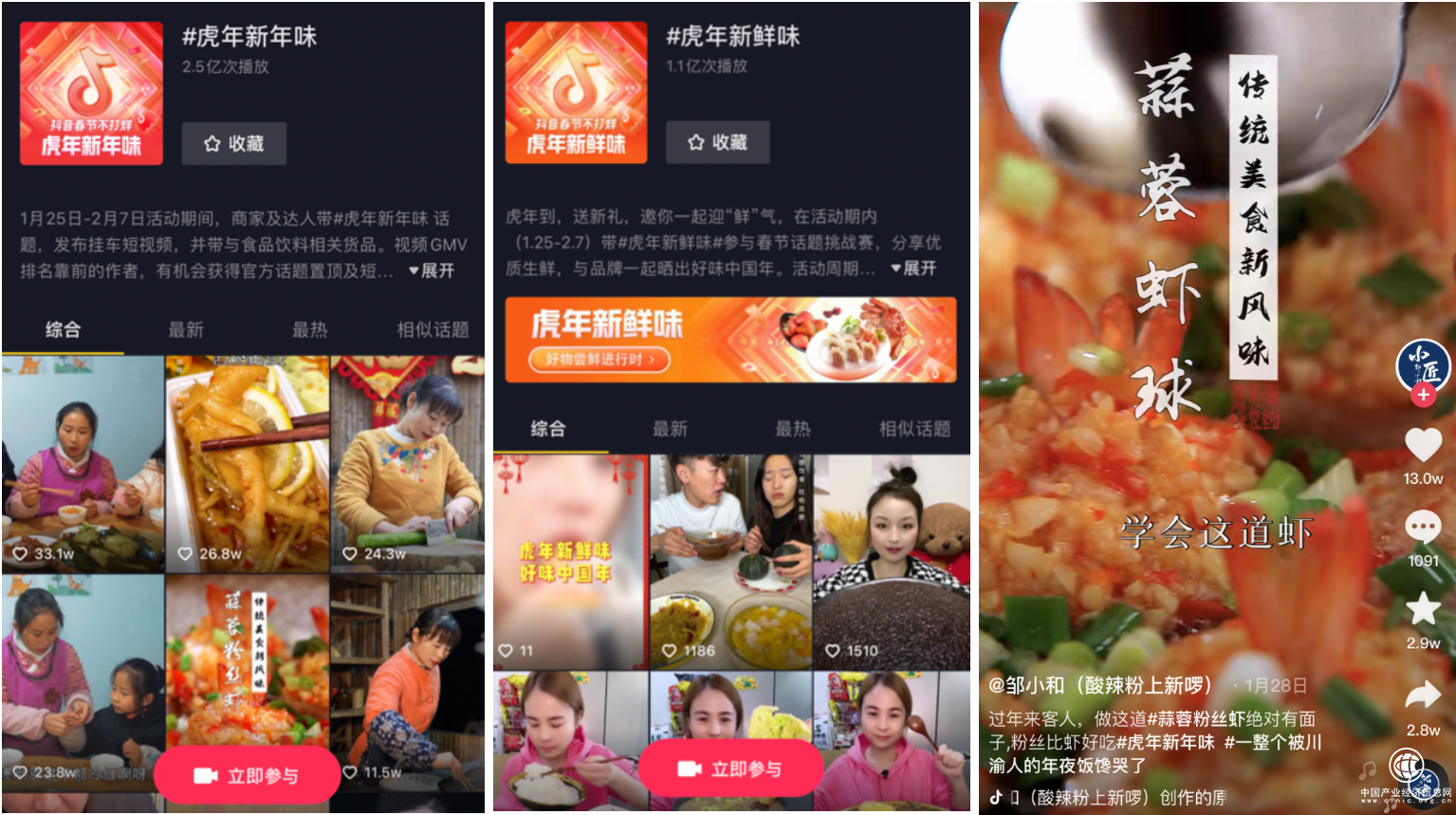 年貨經(jīng)濟(jì)催熱“吃”需求,春節(jié)味道成“流量密碼”。活動(dòng)期間,#虎年新年味 播放量高達(dá)2.5億次,各地特色年貨與菜品做法成熱點(diǎn)話題;#虎年新鮮味 播放量達(dá)味1.1億次,讓更多優(yōu)質(zhì)生鮮貨品進(jìn)入了年夜飯的飯桌。
