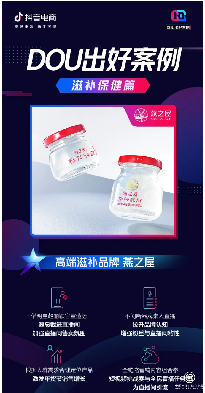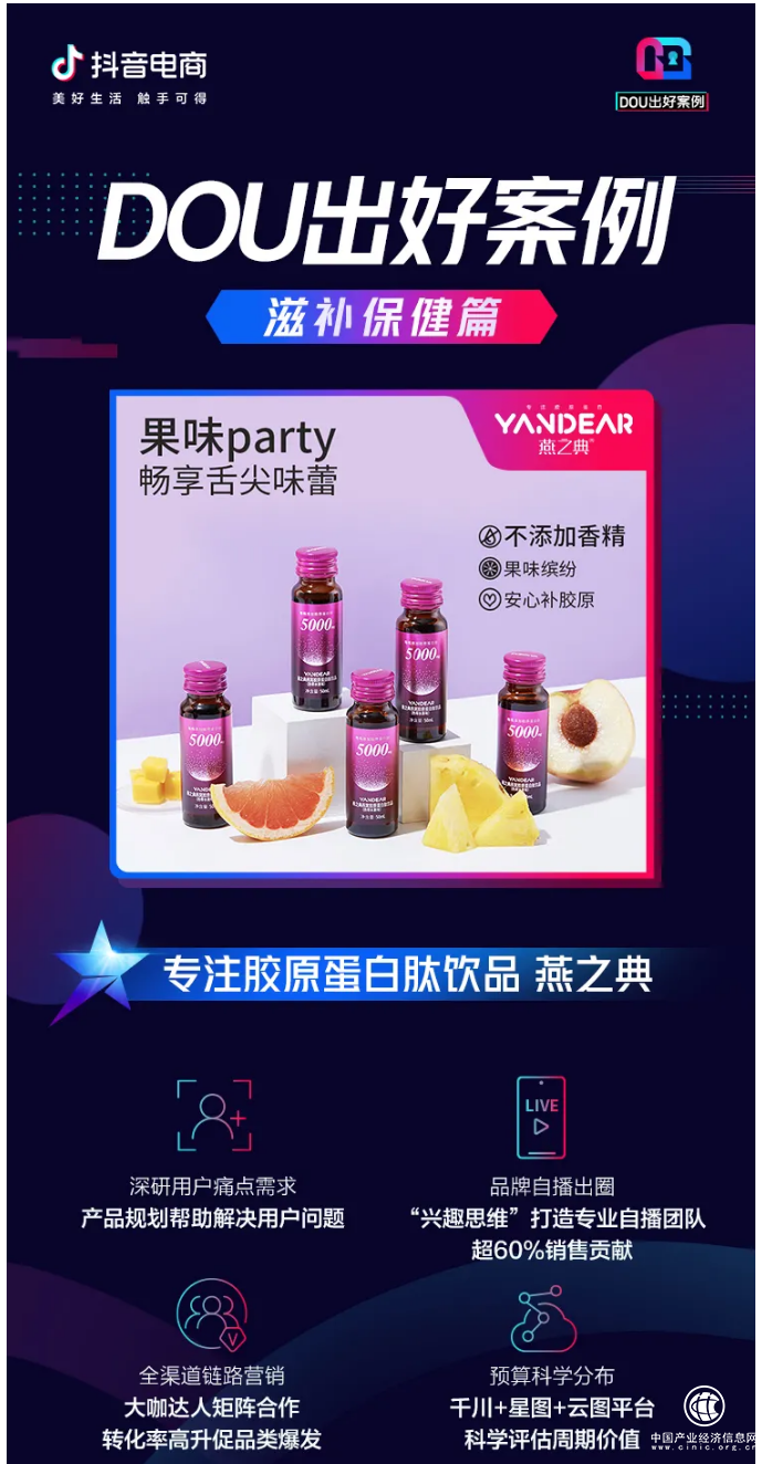 燕之典是專注膠原蛋白肽飲品的知名品牌,其拳頭系列產(chǎn)品——燕之典膠原蛋白肽飲品,聚焦在20-50歲女性人群,品牌推薦人有佘詩曼、黃圣依、胡靜、葉一茜、陶珞依等。自入駐抖音電商以來,燕之典品牌快速發(fā)展,其官方直播間在各大平臺活動中,均位列口服美容爆款榜、膠原蛋白爆款榜前列。