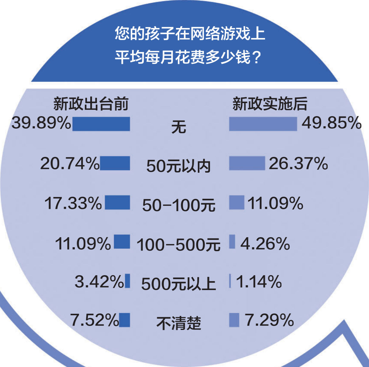 在游戲消費方面,新政出臺前,87.06%的受訪學(xué)生不在網(wǎng)絡(luò)游戲上有所花費;新政出臺后比例提升到90.17%;新政出臺前有6.16%的學(xué)生每月在網(wǎng)絡(luò)游戲上花費“50元以內(nèi)”,新政出臺后縮小到4.48%。家長方面,新政實施前后對比,表示孩子在游戲內(nèi)無消費的受訪者比例從39.89%升至49.85%,消費50-100元以及消費超過100元的比例分別降至11.09%、5.40%。