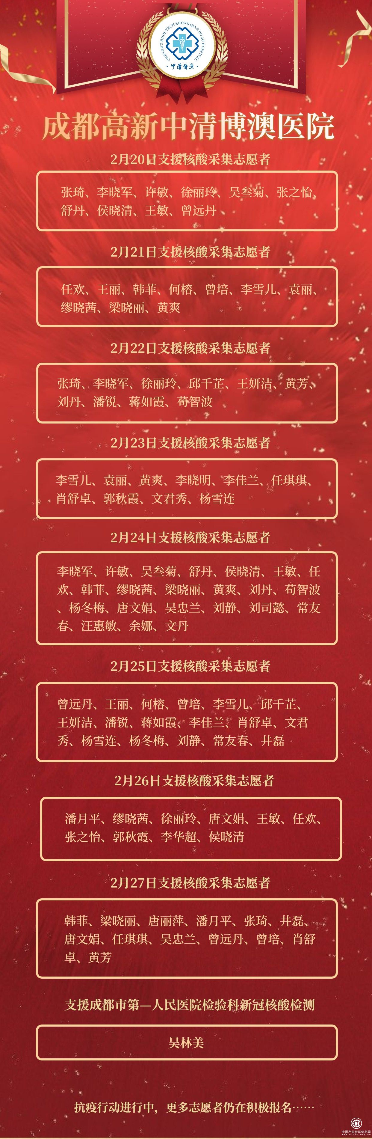 當(dāng)前時期,疫情防控形勢嚴(yán)峻,不容輕視,自2022年2月20日以來,成都高新中清博澳醫(yī)院陸續(xù)接到高新衛(wèi)健局,桂溪街道社區(qū)大規(guī)模核酸采集應(yīng)急通知,醫(yī)務(wù)部迅速響應(yīng),立即啟動相關(guān)預(yù)案,我院醫(yī)護精英積極報名參加志愿活動,迅速組成核酸采樣醫(yī)療支援隊伍,分批次奔赴各地開展核酸采樣工作。