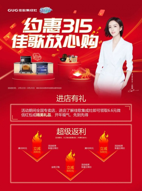 2月22日-3月20日,佳歌隆重推出“約惠315,佳歌放心購”全國聯(lián)動(dòng)大型活動(dòng),讓全國消費(fèi)者以更優(yōu)惠的價(jià)格享受佳歌集成灶高品質(zhì)產(chǎn)品!