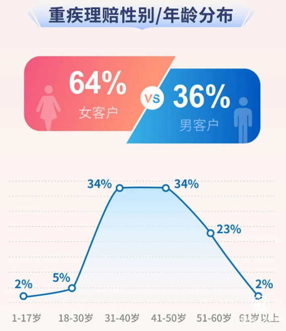 尤其是處于當(dāng)打之年的80、90后,對于健康焦慮最為明顯。同方全球人壽發(fā)布的《2021年理賠年報(bào)》顯示,重疾險(xiǎn)年齡呈年輕化趨勢,中青年已成為主要的理賠群體,其中女性理賠率遠(yuǎn)高于男性。作為家庭經(jīng)濟(jì)支柱的中青年,一旦不幸罹患重疾,整個家庭將面臨沉重的壓力。