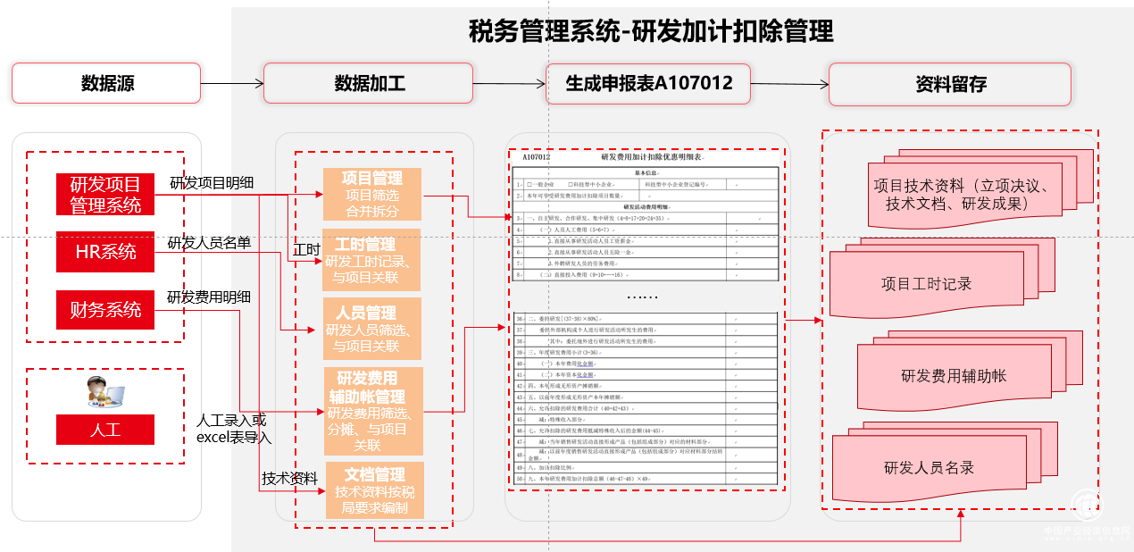 通過項目管理、人力、財務(wù)、資產(chǎn)管理等系統(tǒng),將研發(fā)費(fèi)用加計扣除需要的科技資料、人工工時記錄、資產(chǎn)折舊分?jǐn)偂⒀邪l(fā)費(fèi)用歸集等進(jìn)行聯(lián)動比對,使每一步之間相互一致,嚴(yán)格按照研發(fā)管理流程操作,過程中進(jìn)行管控,并能有效沉淀所有備查資料,保證研發(fā)項目真實、費(fèi)用歸集合理、備查資料完整,使企業(yè)可以安心地享受加計扣除優(yōu)惠政策。
