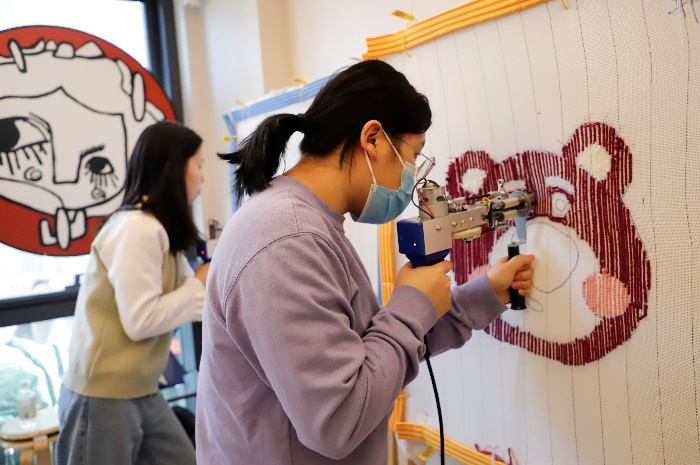 將毛線穿進槍前端的小孔,右手握住槍柄,左手握住平衡桿,扣下扳機,把槍扎進簇絨布,迅速移動,于是一團團五顏六色的毛線在她們的手指翻飛下演變成無限種可能。