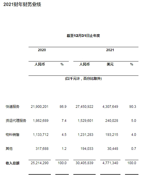 收入總額為人民幣9,217.5 百萬元(1,466.4百萬美元),較2020 年同期的人民幣8,257.1 百萬元增長11.6%。核心快遞服務(wù)收入較2020 年同期增長15.7%,該增長是由于包裹量同比增長17.2%及單票價格下降1.3%的綜合影響所致。貨運(yùn)代理服務(wù)收入較2020 年同期減少38.9%,該減少主要是由于COVID-19疫情之后跨境電商需求和定價逐漸趨于常態(tài)化所致。物料銷售收入主要包括打印電子面單所需的熱敏紙銷售收入,同比增長4.7%。其他收入主要由金融貸款業(yè)務(wù)和廣告服務(wù)的收入組成。