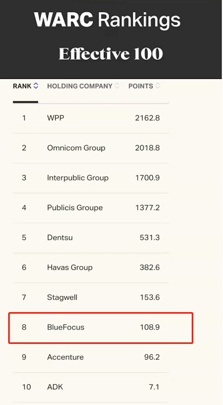 近日,全球權(quán)威廣告營(yíng)銷行業(yè)咨詢機(jī)構(gòu)WARC發(fā)布了2022年度實(shí)效百強(qiáng)榜(Effective 100),藍(lán)色光標(biāo)入選“全球最佳控股公司”TOP10,位列第8名,較去年再進(jìn)一位。藍(lán)色光標(biāo)連續(xù)七年躋身WARC“全球最佳控股公司”TOP10榜單,是唯一進(jìn)入全球前十的中國(guó)營(yíng)銷公司。