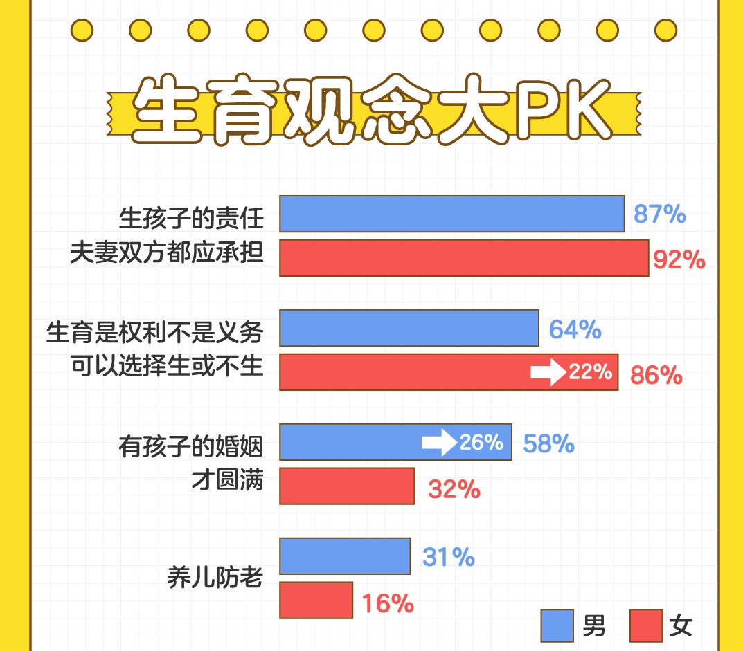 現(xiàn)代社會賦予女性多重角色,生娃、養(yǎng)娃不再是女性一個人的事?!秷蟾妗凤@示,87%非婚男性和92%非婚女性都認同“生育孩子的責任夫妻雙方都應承擔”,這是眾多不同生育觀點中非婚男女認同一致度最高的。