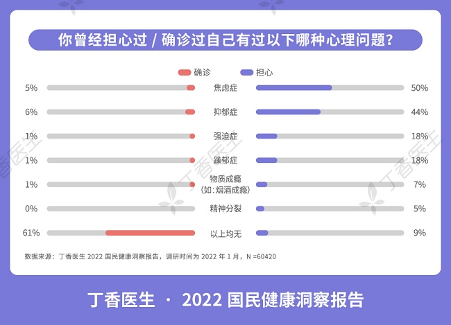 在這次數(shù)據(jù)調(diào)研中,91%的受訪者表示認(rèn)為自己有心理問題。其中,焦慮癥和抑郁癥是心理問題的重災(zāi)區(qū),也有56%的人表示曾擔(dān)心過自己猝死。有趣的是,這其中只有30%的人表示自己確診患上心理疾病,人們擔(dān)心自己有心理問題的比例遠(yuǎn)遠(yuǎn)高于實(shí)際確診的比例,進(jìn)一步揭示出2021年人們所承受的心理壓力之大。