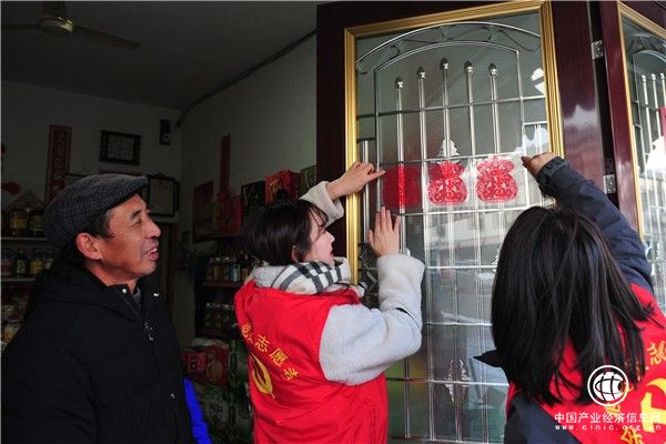 (圖為余姚市煙草專賣局香溢志愿隊在春節(jié)前夕前往四明山區(qū)為零售客戶打掃柜臺,張貼節(jié)日氣氛的窗花)