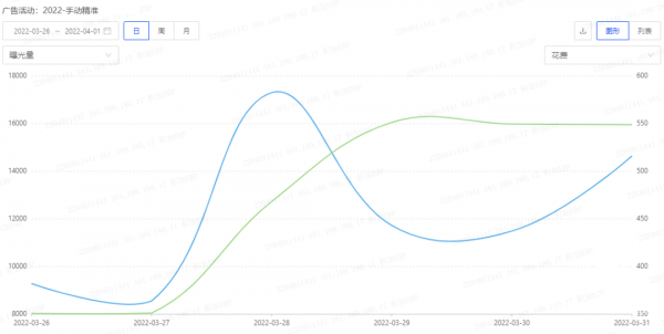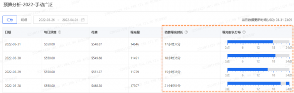 點(diǎn)擊[超出預(yù)算]則可以看到該活動每天的廣告花費(fèi)及曝光時長。例如以下廣告活動,每天下午15-18點(diǎn)廣告預(yù)算就跑完了,基本無法覆蓋到晚上的時段。